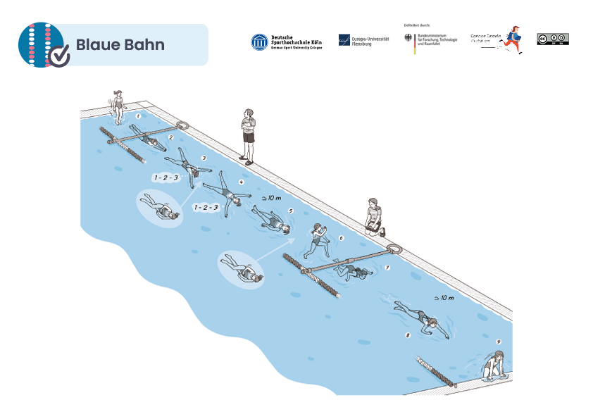 Die Blaue Bahn kombiniert neun Aufgaben, um die schwimmerischen Grundfertigkeiten und die grundlegende Schwimmfähigkeit im Tiefwasser zu überprüfen.