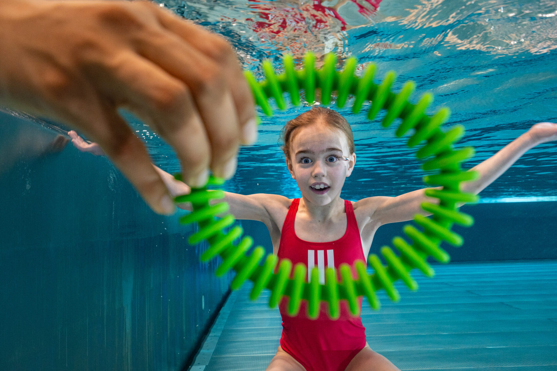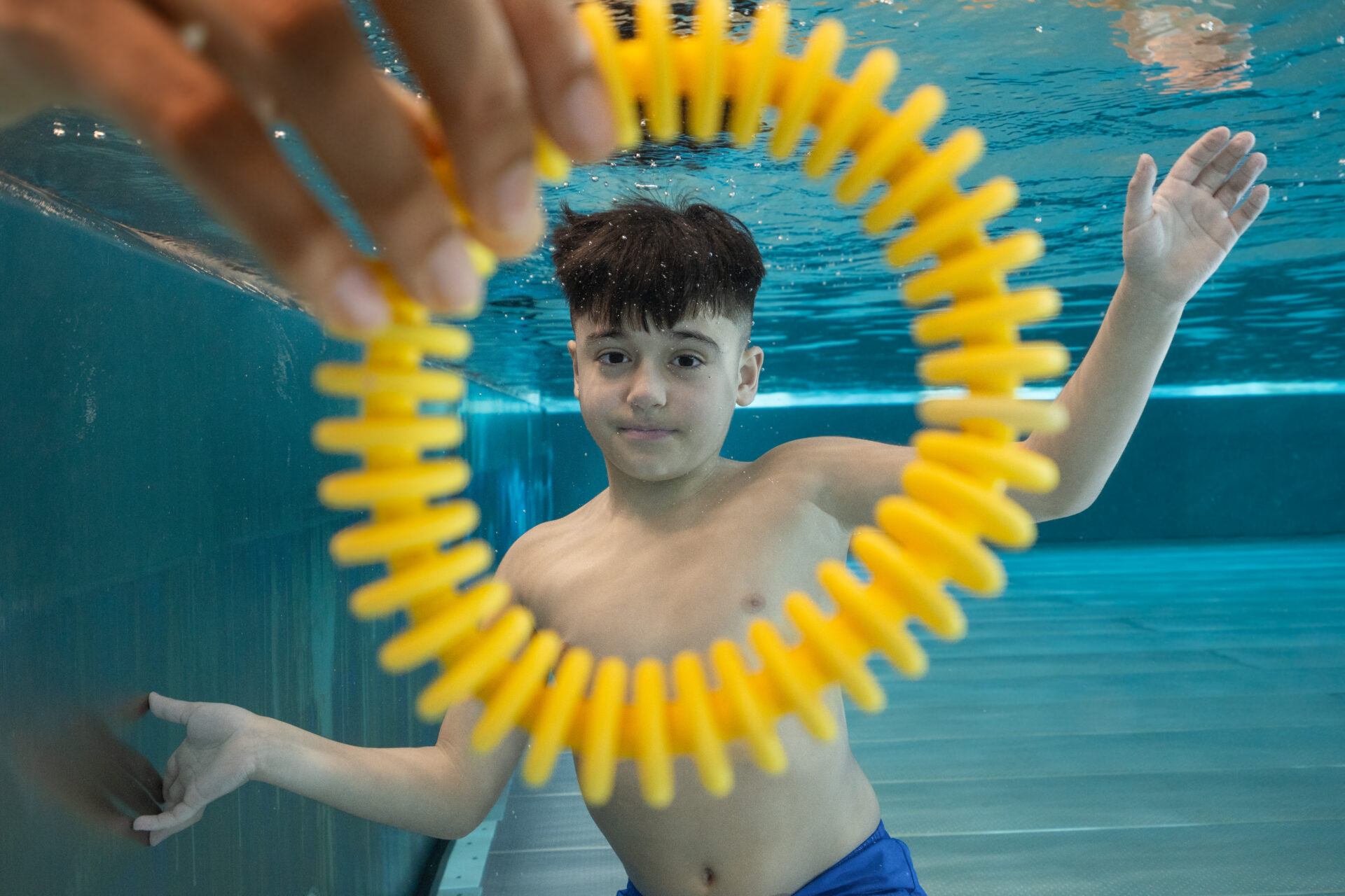 Tauche unter und öffne deine Augen. Erzähle nach dem Auftauchen, was du unter Wasser gesehen hast (z.B. farbigen Ring, bestimmtes Tier, Symbol auf einer Karte, Anzahl von gezeigten Fingern, etc.).