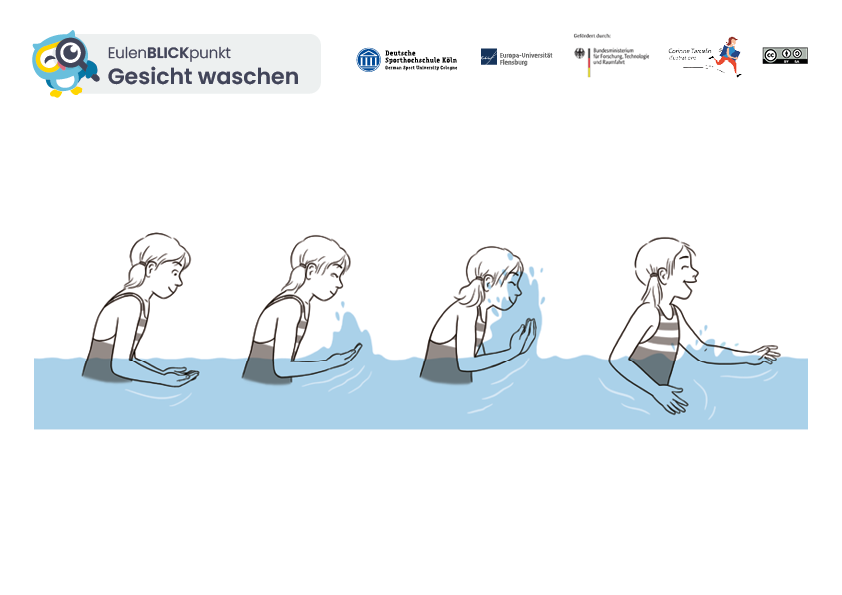 Das Kind steht im Wasser (ungefähr brusttief). Das Kind schaufelt sich mit beiden Händen Wasser ins Gesicht. Das Gesicht darf nicht abgewendet/weggedreht werden werden. Augen-, Nasen- und Mundpartie müssen mit Wasser benetzt werden.