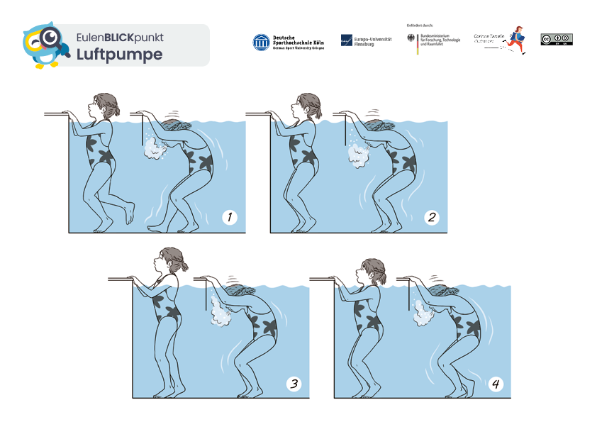 Das Kind hält sich mit beiden Händen am Beckenrand fest, atmet kurz ein, taucht vollständig unter und atmet unter Wasser aktiv durch Mund und/oder Nase aus. Dabei werden deutlich sichtbare „Blubberblasen“ erzeugt. Die Lehrperson begleitet den Rhythmus durch lautes Zählen 1 (beim Einatmen) und 2-3-4 (beim Ausatmen). Der Rhythmus wird mindestens 4x wiederholt. Zur Unterstützung kann die Lehrperson dem Kind eine taktile Hilfe durch leichtes Händedrücken geben.