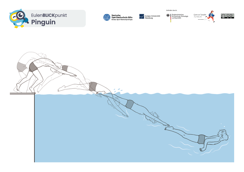 Der Pinguin überprüft das kopfwärtige Springen vom Beckenrand ins mindestens 1,80m tiefe Wasser.