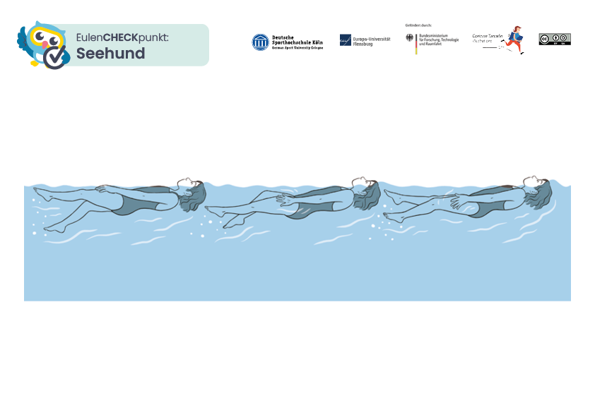 Der Seehund überprüft das Antreiben in Rückenlage und stellt fest, ob das Kind ein Wasserbewegungsgefühl entwickelt hat und zum Antreiben in Rückenlage nutzen kann.