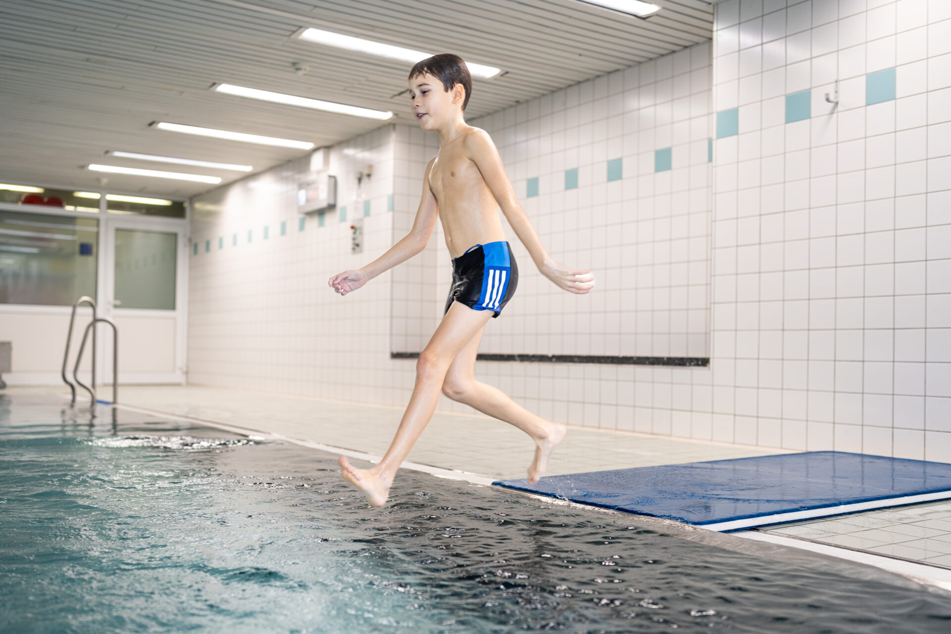 Das Kind steht am Beckenrand. Mindestens ein Fuß wird dabei so platziert, dass die Zehen den Rand umklammern. Das Kind macht einen Schritt nach vorn und springt beidbeinig mit den Füßen zuerst ins (stehtiefe) Wasser. Anschließend klettert das Kind selbstständig über den Beckenrand aus dem Wasser heraus.
