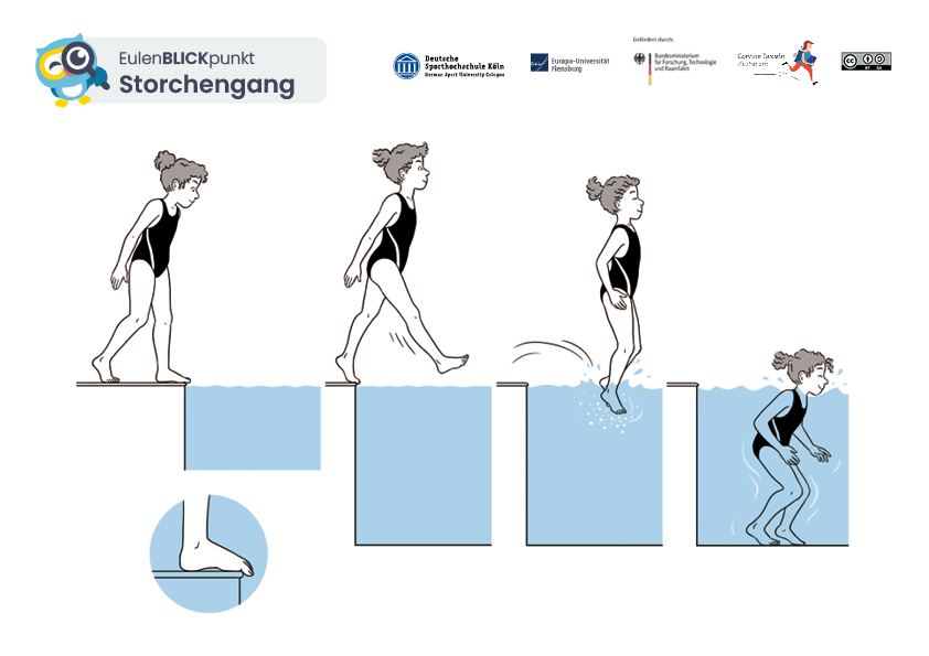 Der Storchengang überprüft das fußwärtige Springen in stehtiefes Wasser.